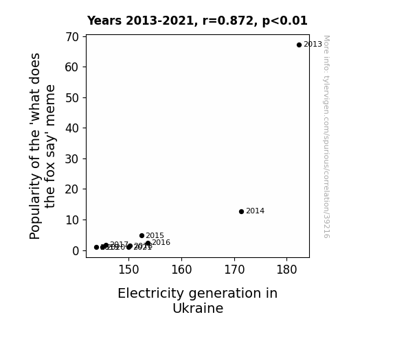 This means 76.1% of the change in the one variable (i.e., Electricity generation in Ukraine) is predictable based on the change in the other (i.e., Popularity of the 'what does the fox say' meme) over the 9 years from 2013 through 2021.