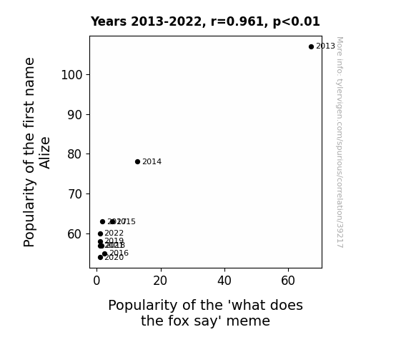 This means 92.3% of the change in the one variable (i.e., Popularity of the 'what does the fox say' meme) is predictable based on the change in the other (i.e., Popularity of the first name Alize) over the 10 years from 2013 through 2022.