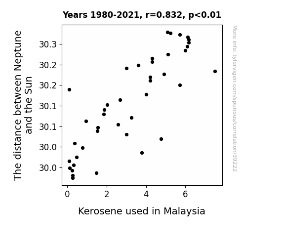 This means 69.2% of the change in the one variable (i.e., Kerosene used in Malaysia) is predictable based on the change in the other (i.e., The distance between Neptune and the Sun) over the 42 years from 1980 through 2021.