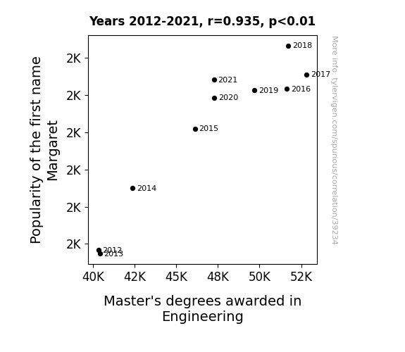 This means 87.5% of the change in the one variable (i.e., Master's degrees awarded in Engineering) is predictable based on the change in the other (i.e., Popularity of the first name Margaret) over the 10 years from 2012 through 2021.