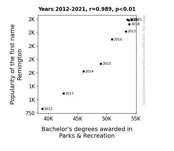 This means 97.8% of the change in the one variable (i.e., Bachelor's degrees awarded in Parks & Recreation) is predictable based on the change in the other (i.e., Popularity of the first name Remington) over the 10 years from 2012 through 2021.