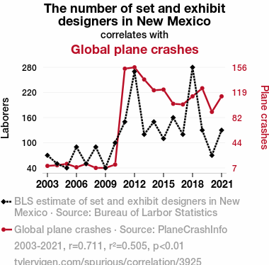 set and exhibit designers, plane crashes, correlation, New Mexico, aviation safety, Bureau of Labor Statistics, PlaneCrashInfo, correlation coefficient, p-value, 2003-2021, set design impact on aviation, causation vs correlation, art of design and science of aviation, aviation safety research