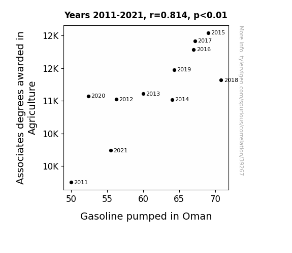 This means 66.2% of the change in the one variable (i.e., Gasoline pumped in Oman) is predictable based on the change in the other (i.e., Associates degrees awarded in Agriculture) over the 11 years from 2011 through 2021.