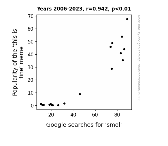 This means 88.8% of the change in the one variable (i.e., Google searches for 'smol') is predictable based on the change in the other (i.e., Popularity of the 'this is fine' meme) over the 18 years from 2006 through 2023.