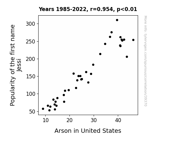 This means 91% of the change in the one variable (i.e., Arson in United States) is predictable based on the change in the other (i.e., Popularity of the first name Jessi) over the 38 years from 1985 through 2022.