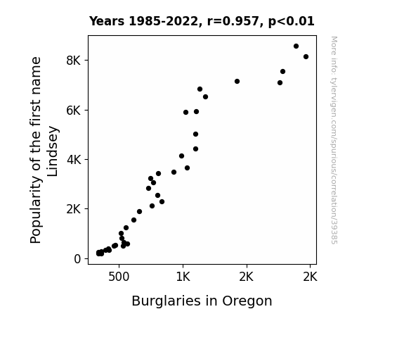 This means 91.6% of the change in the one variable (i.e., Burglaries in Oregon) is predictable based on the change in the other (i.e., Popularity of the first name Lindsey) over the 38 years from 1985 through 2022.