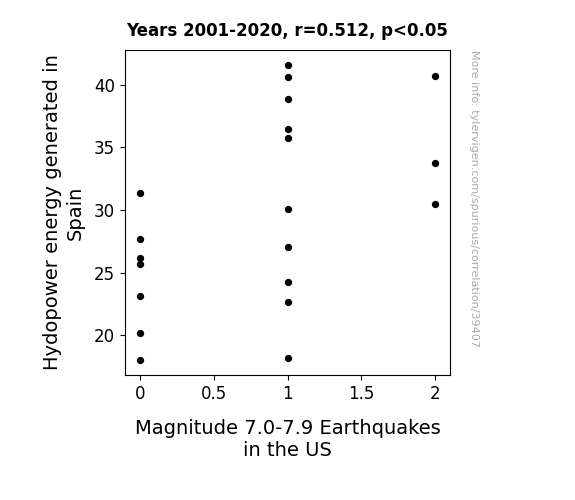 This means 26.2% of the change in the one variable (i.e., Magnitude 7.0-7.9 Earthquakes in the US) is predictable based on the change in the other (i.e., Hydopower energy generated in Spain) over the 20 years from 2001 through 2020.