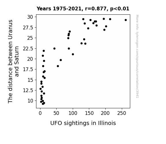 This means 76.9% of the change in the one variable (i.e., UFO sightings in Illinois) is predictable based on the change in the other (i.e., The distance between Uranus and Saturn) over the 47 years from 1975 through 2021.