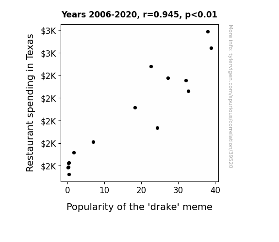 This means 89.2% of the change in the one variable (i.e., Popularity of the 'drake' meme) is predictable based on the change in the other (i.e., Restaurant spending in Texas) over the 15 years from 2006 through 2020.