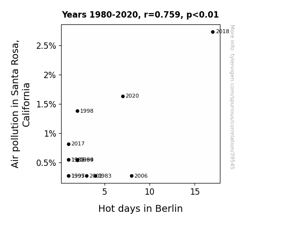 This means 57.6% of the change in the one variable (i.e., Hot days in Berlin) is predictable based on the change in the other (i.e., Air pollution in Santa Rosa, California) over the 13 years from 1980 through 2020.