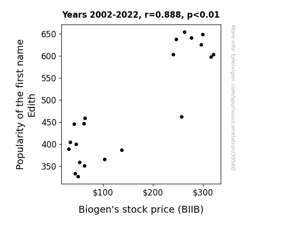 This means 78.8% of the change in the one variable (i.e., Biogen's stock price (BIIB)) is predictable based on the change in the other (i.e., Popularity of the first name Edith) over the 21 years from 2002 through 2022.