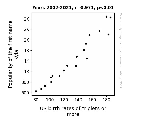 This means 94.3% of the change in the one variable (i.e., US birth rates of triplets or more) is predictable based on the change in the other (i.e., Popularity of the first name Kyla) over the 20 years from 2002 through 2021.