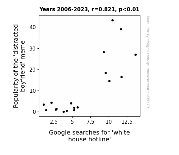 This means 67.5% of the change in the one variable (i.e., Google searches for 'white house hotline') is predictable based on the change in the other (i.e., Popularity of the 'distracted boyfriend' meme) over the 18 years from 2006 through 2023.
