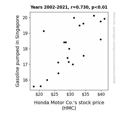 This means 53.3% of the change in the one variable (i.e., Honda Motor Co.'s stock price (HMC)) is predictable based on the change in the other (i.e., Gasoline pumped in Singapore) over the 20 years from 2002 through 2021.