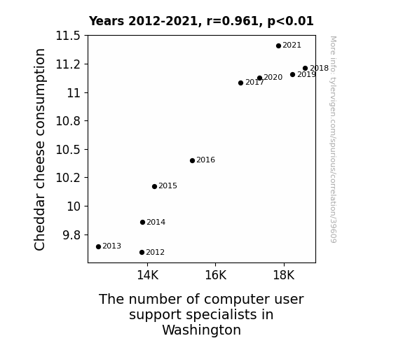 This means 92.3% of the change in the one variable (i.e., The number of computer user support specialists in Washington) is predictable based on the change in the other (i.e., Cheddar cheese consumption) over the 10 years from 2012 through 2021.