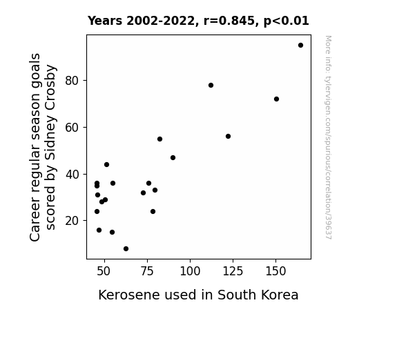This means 71.4% of the change in the one variable (i.e., Kerosene used in South Korea) is predictable based on the change in the other (i.e., Career regular season goals scored by Sidney Crosby) over the 21 years from 2002 through 2022.