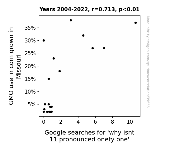 This means 50.8% of the change in the one variable (i.e., Google searches for 'why isnt 11 pronounced onety one') is predictable based on the change in the other (i.e., GMO use in corn grown in Missouri) over the 19 years from 2004 through 2022.