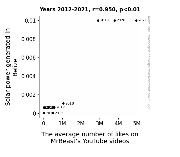 This means 90.3% of the change in the one variable (i.e., The average number of likes on MrBeast's YouTube videos) is predictable based on the change in the other (i.e., Solar power generated in Belize) over the 10 years from 2012 through 2021.
