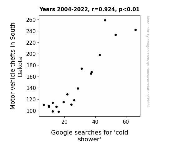 This means 85.4% of the change in the one variable (i.e., Google searches for 'cold shower') is predictable based on the change in the other (i.e., Motor vehicle thefts in South Dakota) over the 19 years from 2004 through 2022.
