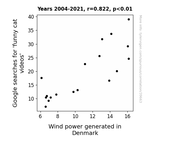 This means 67.6% of the change in the one variable (i.e., Wind power generated in Denmark) is predictable based on the change in the other (i.e., Google searches for 'funny cat videos') over the 18 years from 2004 through 2021.