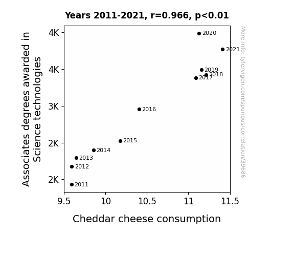 This means 93.2% of the change in the one variable (i.e., Cheddar cheese consumption) is predictable based on the change in the other (i.e., Associates degrees awarded in Science technologies) over the 11 years from 2011 through 2021.