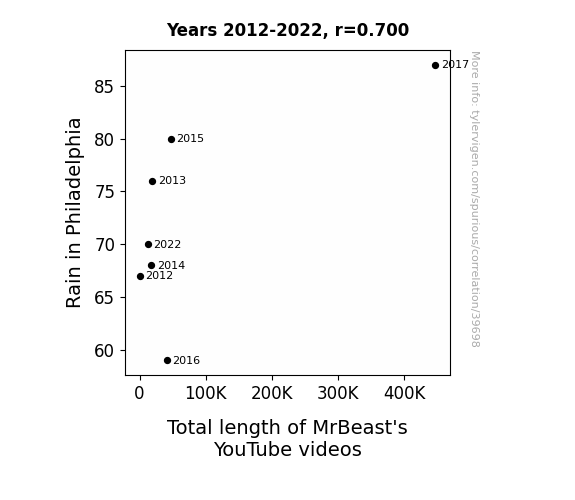 This means 48.9% of the change in the one variable (i.e., Total length of MrBeast's YouTube videos) is predictable based on the change in the other (i.e., Rain in Philadelphia) over the 7 years from 2012 through 2022.