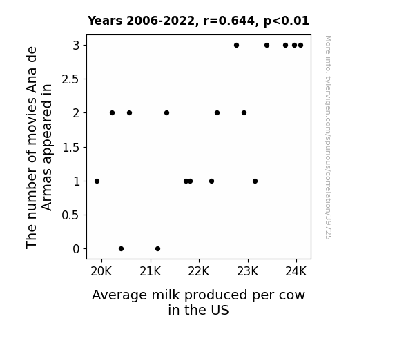 This means 41.4% of the change in the one variable (i.e., Average milk produced per cow in the US) is predictable based on the change in the other (i.e., The number of movies Ana de Armas appeared in) over the 17 years from 2006 through 2022.