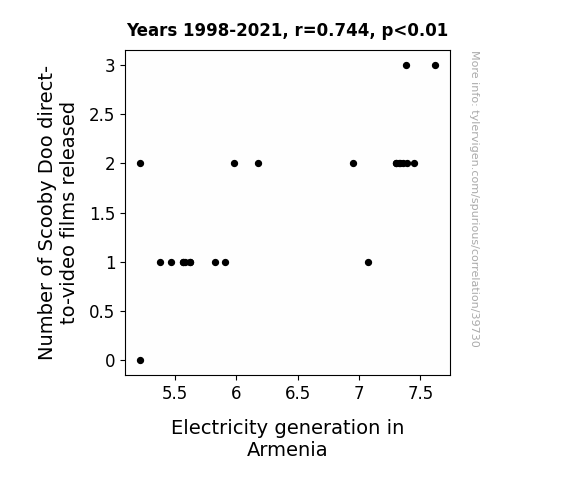 This means 55.4% of the change in the one variable (i.e., Electricity generation in Armenia) is predictable based on the change in the other (i.e., Number of Scooby Doo direct-to-video films released) over the 24 years from 1998 through 2021.
