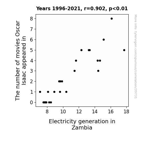 This means 81.3% of the change in the one variable (i.e., Electricity generation in Zambia) is predictable based on the change in the other (i.e., The number of movies Oscar Isaac appeared in) over the 26 years from 1996 through 2021.