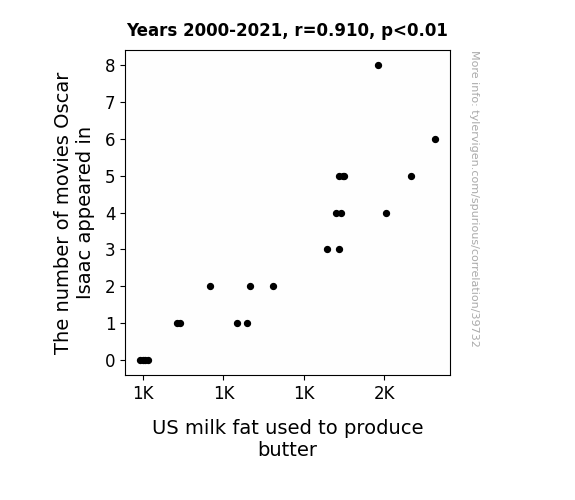 This means 82.8% of the change in the one variable (i.e., US milk fat used to produce butter) is predictable based on the change in the other (i.e., The number of movies Oscar Isaac appeared in) over the 22 years from 2000 through 2021.