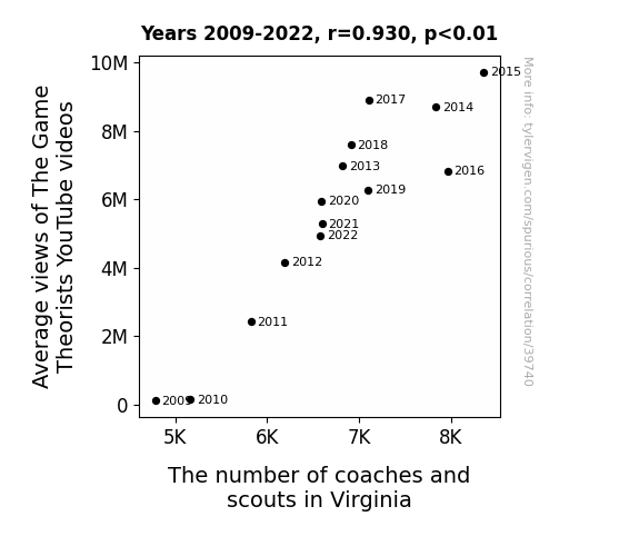 This means 86.5% of the change in the one variable (i.e., The number of coaches and scouts in Virginia) is predictable based on the change in the other (i.e., Average views of The Game Theorists YouTube videos) over the 14 years from 2009 through 2022.