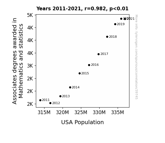 This means 96.4% of the change in the one variable (i.e., USA Population) is predictable based on the change in the other (i.e., Associates degrees awarded in Mathematics and statistics) over the 11 years from 2011 through 2021.