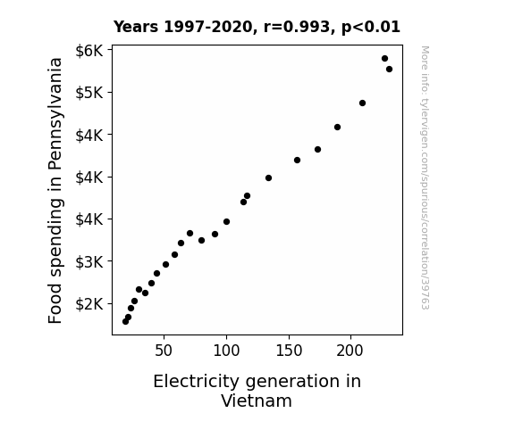 This means 98.7% of the change in the one variable (i.e., Electricity generation in Vietnam) is predictable based on the change in the other (i.e., Food spending in Pennsylvania) over the 24 years from 1997 through 2020.