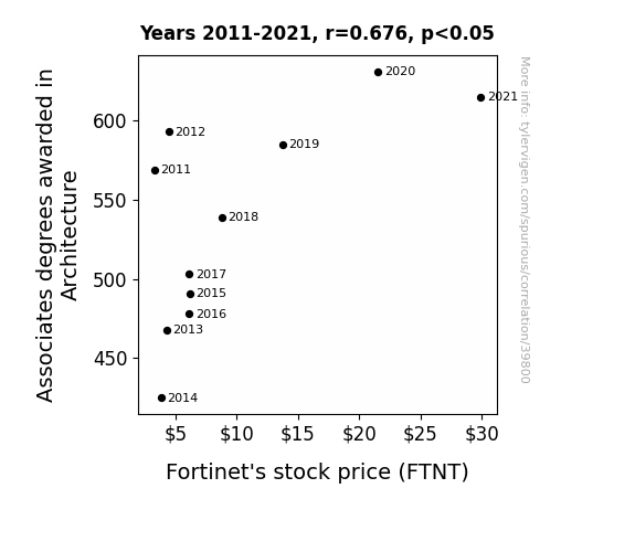 This means 45.7% of the change in the one variable (i.e., Fortinet's stock price (FTNT)) is predictable based on the change in the other (i.e., Associates degrees awarded in Architecture) over the 11 years from 2011 through 2021.