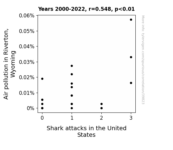 This means 30% of the change in the one variable (i.e., Shark attacks in the United States) is predictable based on the change in the other (i.e., Air pollution in Riverton, Wyoming) over the 23 years from 2000 through 2022.