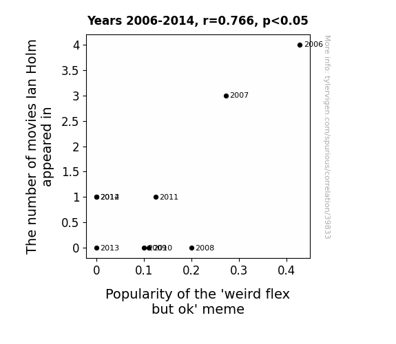 This means 58.7% of the change in the one variable (i.e., Popularity of the 'weird flex but ok' meme) is predictable based on the change in the other (i.e., The number of movies Ian Holm appeared in) over the 9 years from 2006 through 2014.