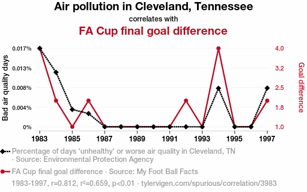 - The spurious research paper: Blowing the Whistle: Exploring the Impacts of Air Pollution on FA Cup Final Goal Difference in Cleveland, Tennessee