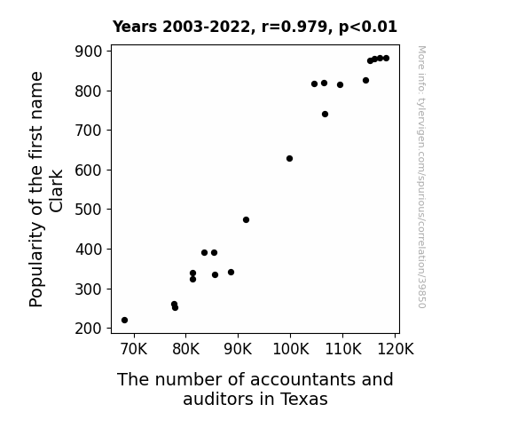 This means 95.9% of the change in the one variable (i.e., The number of accountants and auditors in Texas) is predictable based on the change in the other (i.e., Popularity of the first name Clark) over the 20 years from 2003 through 2022.