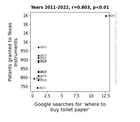 This means 64.5% of the change in the one variable (i.e., Google searches for 'where to buy toilet paper') is predictable based on the change in the other (i.e., Patents granted to Texas Instruments) over the 12 years from 2011 through 2022.