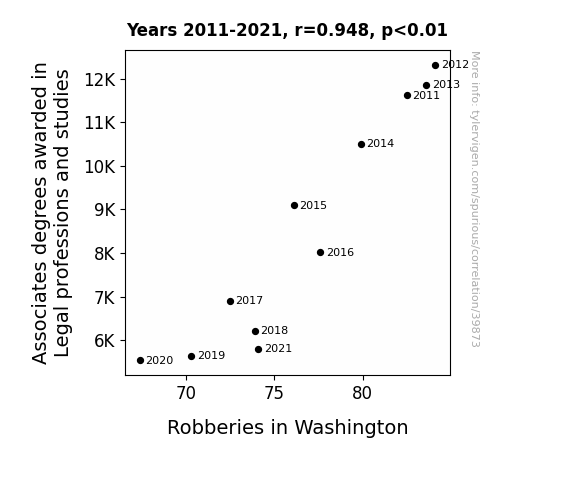 This means 89.9% of the change in the one variable (i.e., Robberies in Washington) is predictable based on the change in the other (i.e., Associates degrees awarded in Legal professions and studies) over the 11 years from 2011 through 2021.