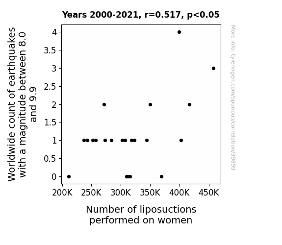 This means 26.8% of the change in the one variable (i.e., Number of liposuctions performed on women) is predictable based on the change in the other (i.e., Worldwide count of earthquakes with a magnitude between 8.0 and 9.9) over the 22 years from 2000 through 2021.