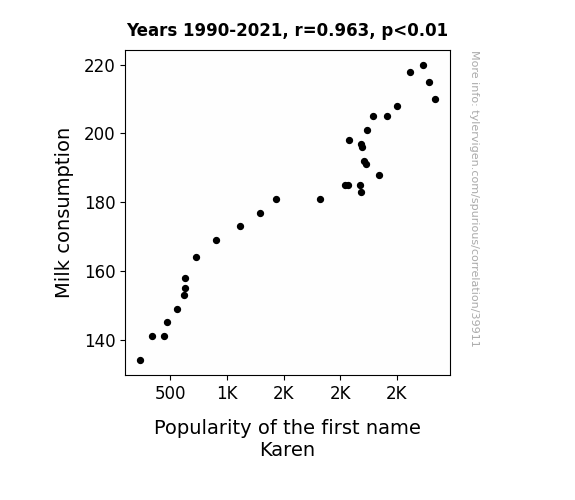 This means 92.7% of the change in the one variable (i.e., Popularity of the first name Karen) is predictable based on the change in the other (i.e., Milk consumption) over the 32 years from 1990 through 2021.