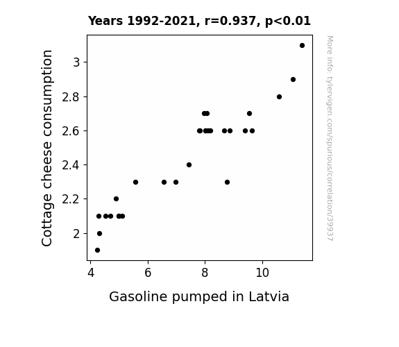This means 87.8% of the change in the one variable (i.e., Gasoline pumped in Latvia) is predictable based on the change in the other (i.e., Cottage cheese consumption) over the 30 years from 1992 through 2021.