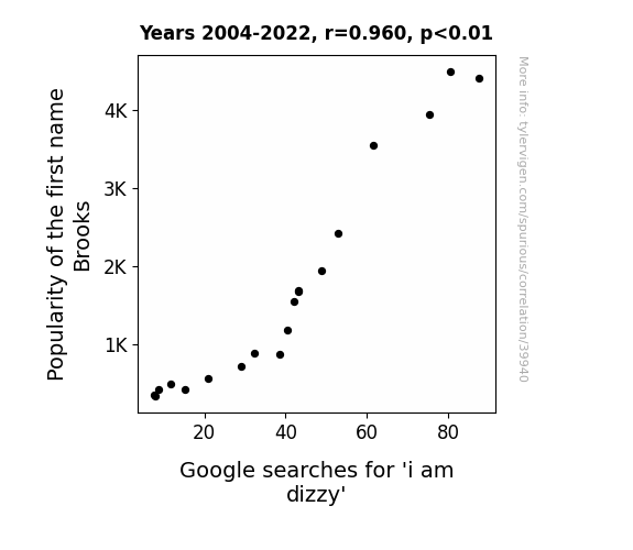 This means 92.1% of the change in the one variable (i.e., Google searches for 'i am dizzy') is predictable based on the change in the other (i.e., Popularity of the first name Brooks) over the 19 years from 2004 through 2022.