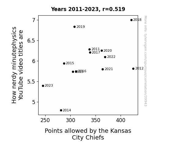 This means 26.9% of the change in the one variable (i.e., Points allowed by the Kansas City Chiefs) is predictable based on the change in the other (i.e., How nerdy minutephysics YouTube video titles are) over the 13 years from 2011 through 2023.