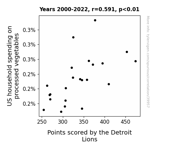 This means 35% of the change in the one variable (i.e., Points scored by the Detroit Lions) is predictable based on the change in the other (i.e., US household spending on processed vegetables) over the 23 years from 2000 through 2022.