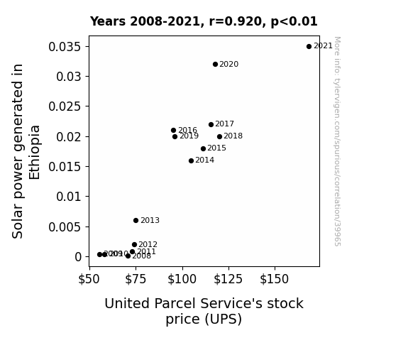 This means 84.7% of the change in the one variable (i.e., United Parcel Service's stock price (UPS)) is predictable based on the change in the other (i.e., Solar power generated in Ethiopia) over the 14 years from 2008 through 2021.