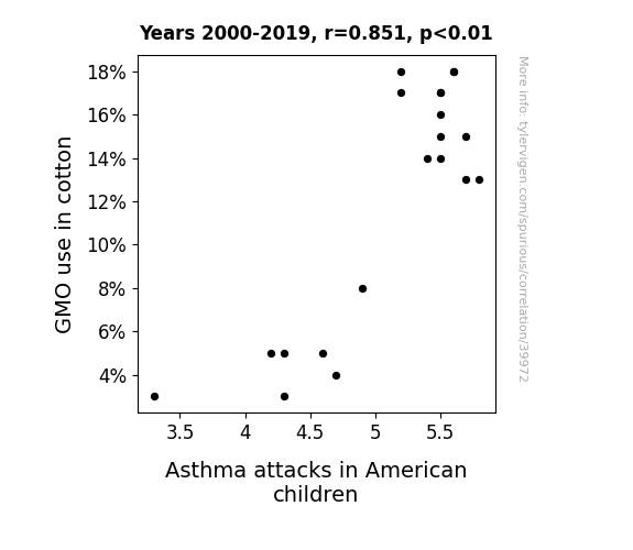 This means 72.4% of the change in the one variable (i.e., Asthma attacks in American children) is predictable based on the change in the other (i.e., GMO use in cotton) over the 20 years from 2000 through 2019.