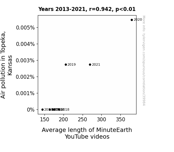 This means 88.8% of the change in the one variable (i.e., Average length of MinuteEarth YouTube videos) is predictable based on the change in the other (i.e., Air pollution in Topeka, Kansas) over the 9 years from 2013 through 2021.