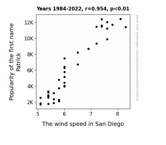 This means 91.1% of the change in the one variable (i.e., The wind speed in San Diego) is predictable based on the change in the other (i.e., Popularity of the first name Patrick) over the 39 years from 1984 through 2022.